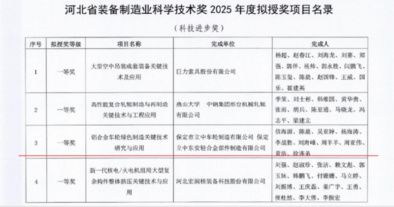 立中車輪集團項目獲2025年度河北省裝備制造業科學技術獎一等獎