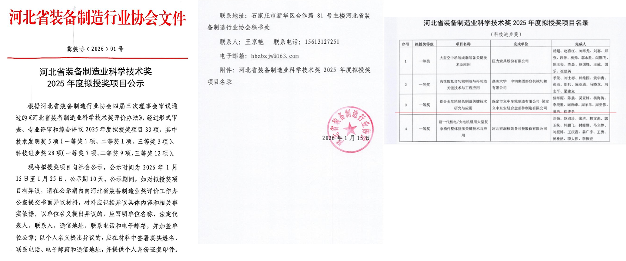 2026年1月15日,河北省裝備制造業科學技術獎2025年度擬授獎項目公示,由保定市立中車輪制造有限公司和保定立中東安輕合金部件制造有限公司共同完成的“鋁合金車輪綠色制造關鍵技術研究與應用”項目,榮獲科技進步獎一等獎。